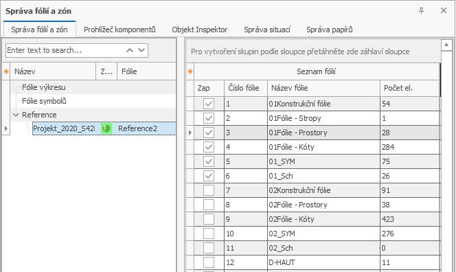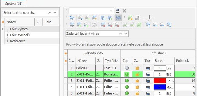 Do správy fólií bylo přidáno další okno, aby přepínání fólií ve SPIRITu 2025, a to jak pro fólie výkresu, tak pro fólie symbolů, zůstalo konzistentní a sledovatelné. V této oblasti se zobrazují fólie výkresu, fólie symbolů a fólie referencí. Slouží k ovládání, ale také k přehledné editaci a úpravám fólií ve SPIRITu.