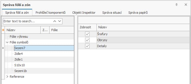 Zatímco uzel Fólie výkresu zobrazuje známý dialogový panel Fólie, všechny instance symbolů ve výkresu se zobrazují v oblasti Fólie symbolů. Viditelnost příslušných fólií lze zde upravit pomocí sloupce Zobrazit.