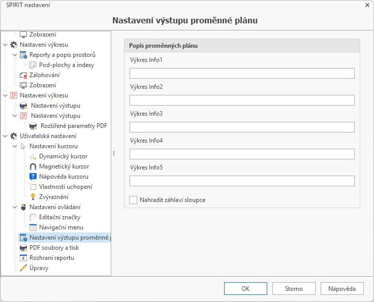 Aby bylo jasné, o jaký obsah se jedná a k čemu byl příslušný sloupec Info 1Info 5 použit, existuje ve SPIRITu 2025 nastavení. V nastavení programu vyberte Uživatelská nastavení > Nastavení výstupu proměnné plánu. Zde můžete tyto sloupce libovolně definovat a aktivujte volbu Nahradit záhlaví sloupce. Pak budou příslušné sloupce v dokovacím dialogu Správa situací a Správa papírů označeny podle definovaných názvů, což výrazně usnadňuje vyplňování informací o plánu.